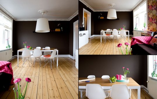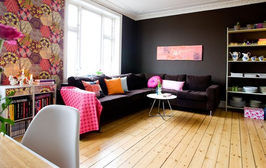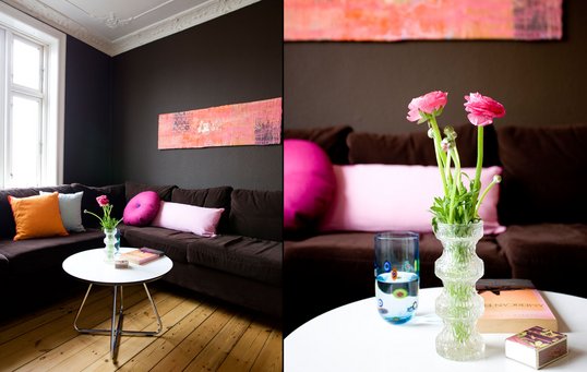 - Jeg har inddraget det lille kammer ved siden af stuen og selv revet væggen ned for at få en større stue med plads til et bredt spisebord og en hjørnesofa, fortæller Marie Louise, der ikke er bange for at bruge farver på væggene, som skaber hulestemning.
