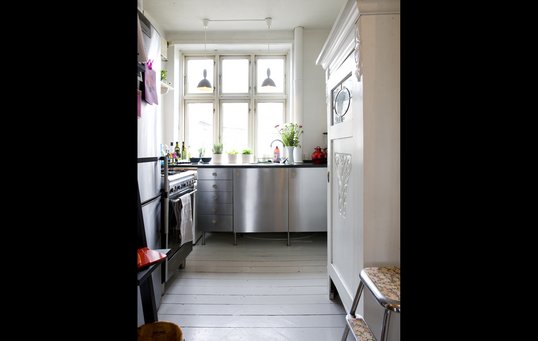 Da Vickie første gang for to år siden trådte ind i lejligheden, der netop var blevet renoveret, faldt hun pladask for det store lyse køkken og udsigten til gårdmiljøet. Gangen og det gamle spisekammer er inddraget for at udvide køkkenet, der er dejlig lyst og stort.