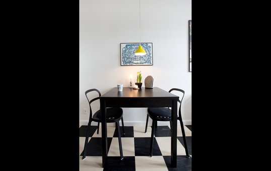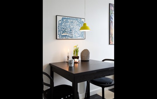 - Lav spisebord og arbejdsbord i ét og stil det i et indhak i rummet, så synes det mindre.