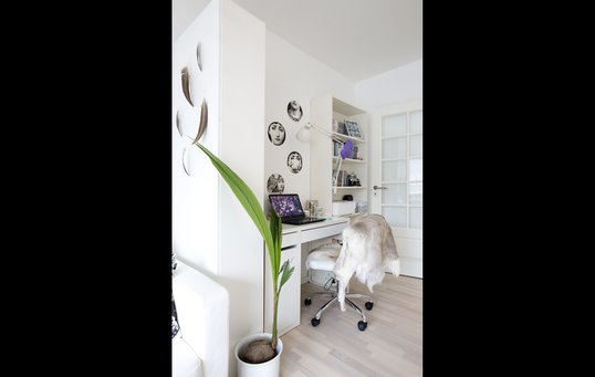 Hun har med stor bevidsthed og planlægning indrettet sig på minimal plads. Et arbejdsbord er bygget ind i nichen og fylder minimalt. Alle vægge og møbler er holdt i lyse farver, der får rummet til at virke større, og i forbindelse med entreen er bygget et walk-in closet.