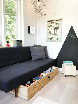 - Møbler med indbygget opbevaring er smarte, især hvis pladsen er trang, men også hvis man ønsker at frigøre mere gulvplads til leg. Det kan fx være senge med skuffer, slagbænke og kasser med låg, der også kan bruges som siddemøbler.