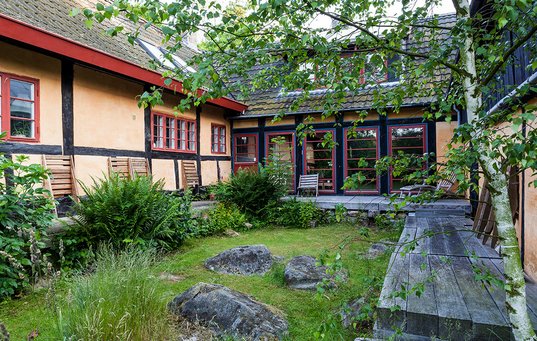 Gårdspladsen er omgivet af tre blanke søer med siv, åkander og dunhammere, der tager sig noget så idyllisk ud på sådan en lun solskinsdag. Ved huset tager Torben Bille imod. Han og Marianne har siden 1979 ejet huset og – ikke mindst – den store og multiudtryksfulde have, der omgiver det.