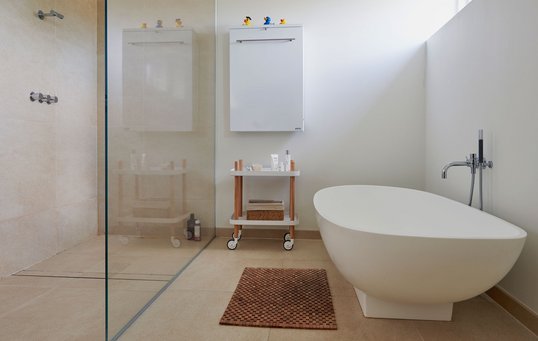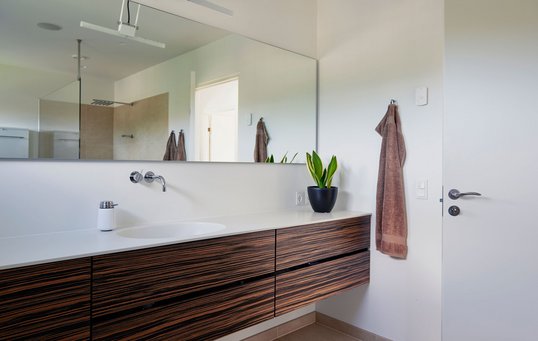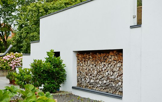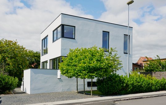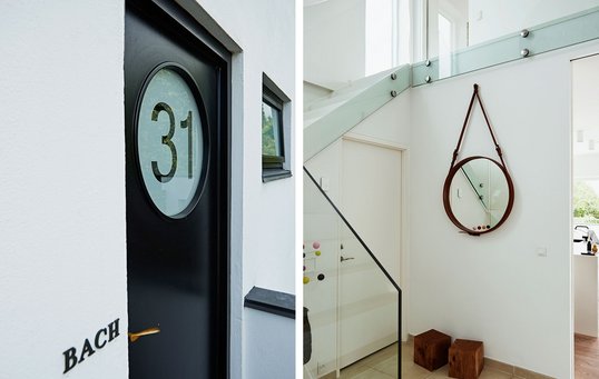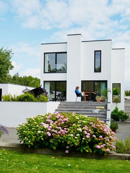 Familien Bach fik en moderne funkisvilla i 2 planer. At bygge i højden har givet mere plads til både have og en glidende overgang mellem inde- og uderum, som var et varmt ønske fra parret. Fra køkken-alrummet er der udgang til en morgenterrasse, og fra stuen til en aftenterrasse/gårdhave. Førstesalen har store vinduespartier/lysindfald på de 3 sider, der får mest sol.