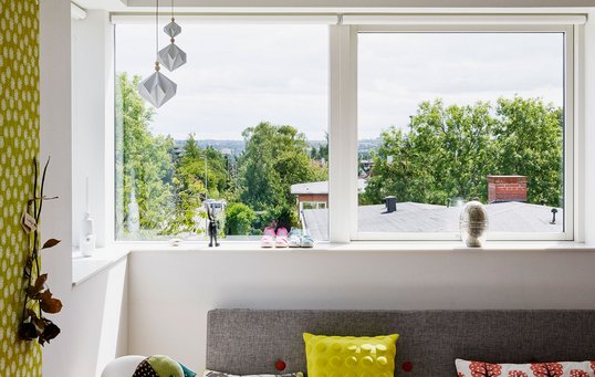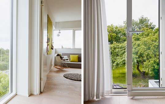 Gevinsten ved at bygge ovenpå i stedet for til er bl.a., at familien har fået mere plads i haven til terrasser og hyggelige uderum. Dertil kommer, at de har fået en flot udsigt over Åbyhøj og ådalen vest for Aarhus, og fantastiske lysindfald fra førstesalens store vinduespartier.