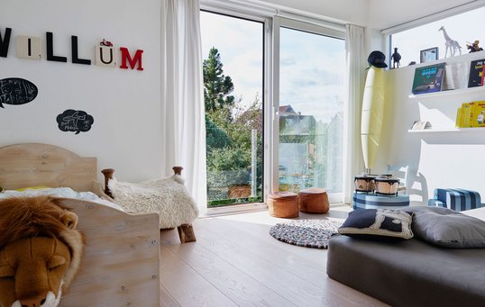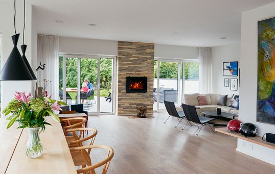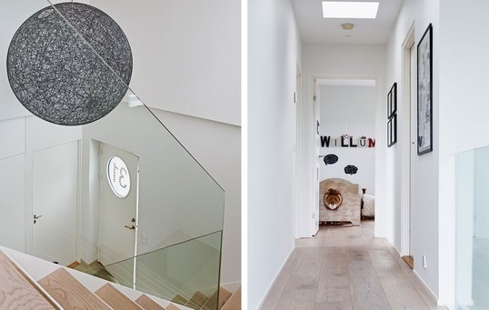 Hele indretningen er udtænkt, så den passer til en familie med 3 små børn. Der er legezoner i stuen, som ligger i forlængelse af køkken-alrummet, hvorfra der er udgang til aftenterrassen bag huset. Desuden er en stor zone på førstesalen bygget med lette skillevægge, så det er nemmere at lave om på rumfordelingen, når børnene bliver større.