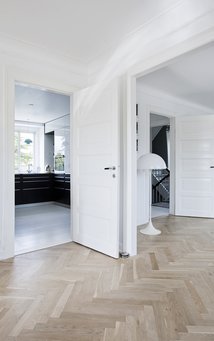 I det hele taget har Thomas Hjort lagt vægt på at genbruge, hvor der kan genbruges. De gamle fyldningsdøre var de fleste steder dækket med finérplader, som blev fjernet, og dørene blev renset, spartlet ud og malet, mens nye, gamle dørhåndtag blev fundet hos www.genbyg.dk.