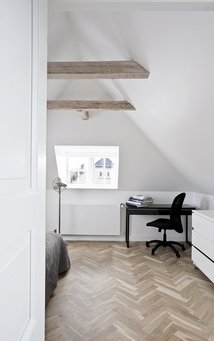I værelserne og køkkenet på de 2 etager måtte der lægges nyt plankegulv, men i stuen og på det ene af værelserne ovenpå er det gamle sildebensparket blevet renset og poleret.