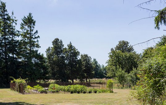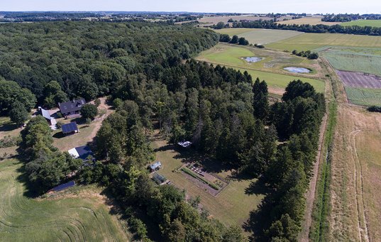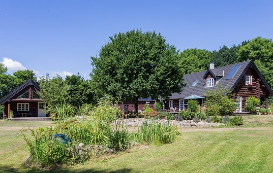Fra grusvejen begynder, er der omtrent halvanden kilometer, før den slutter ved en skov. Her ligger et canadisk bjælkehus i en summende og frodig have.