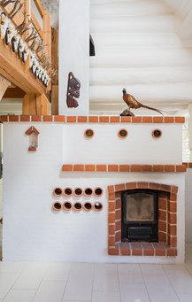 Som en ekstra varmekilde har de en såkaldt finsk masseovn, som står centralt indbygget i stuen, så den varmer hele huset op – og endda giver familien mulighed for at bage pizzaer fra ovnen i køkkensiden. Brændet kommer i bunkevis fra de mange hektar skov, som bjælkehuset er omgivet af her på Sydsjælland.