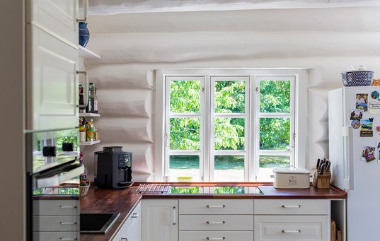 - Køleskabet kan ikke stå helt ind mod væggen, og køkkenskabene måtte skæres til, så de passer til bjælkernes profil.