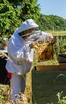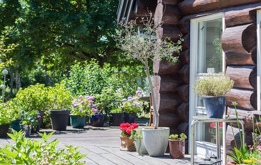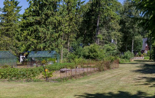 – I vores alder kan man ikke vente 10 år på at få en flot have. Jeg aner jo ikke engang, om jeg er her om 10 år. Derfor besluttede jeg, at det skulle være en flot have fra begyndelsen, og det er jeg taknemmelig for nu, siger hun og kigger ned gennem haven, som slutter med en enorm køkkenhave. Her er hele to drivhuse, og en række højbede giver squash, jordbær og andre gode ting hele sommeren.