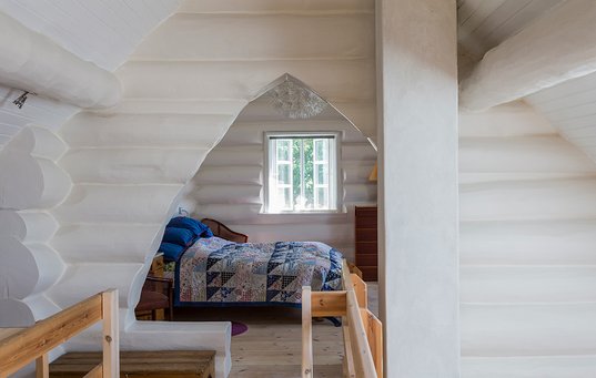 Derefter malede hun hele huset hvidt indvendigt, så bjælkevæggene nu fremstår kridhvide og sammen med et par nye ovenlysvinduer giver lys i hele huset.