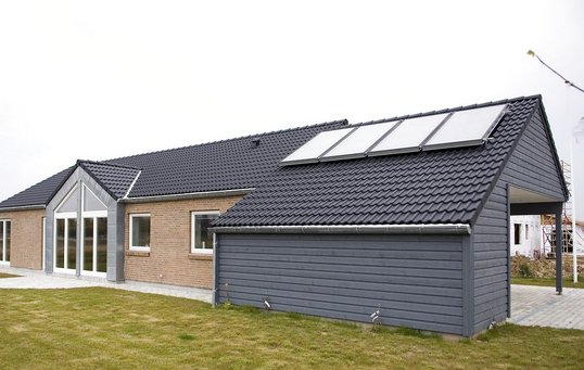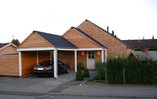 Carport i tæt på skel i samme materialer som hovedhuset. Arkivfoto.