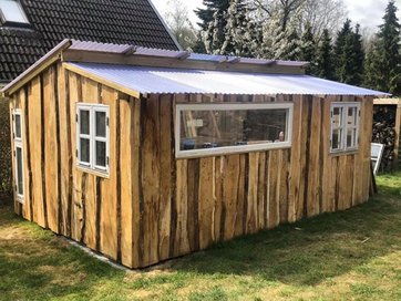 Roy Jepsen har bygget dette flotte skur, som fremover bliver hjemsted for værkstedsbord, plæneklipper og opbavering.