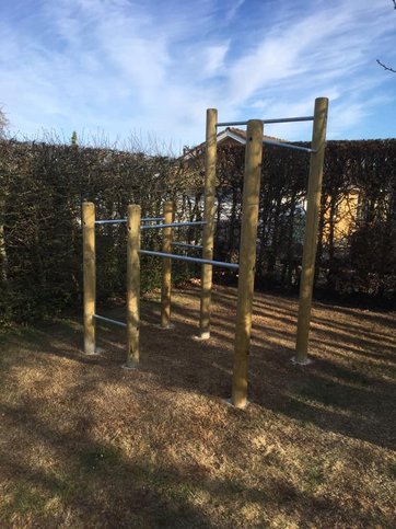 Hos Lise Kirk Sahl har manden og datteren været i gang med at bygge træningsstativ af 120 mm stolper og 1" galvaniserede rør. På den måde er der lagt op til ekstra aktivitet i haven, også når projektet er afsluttet.