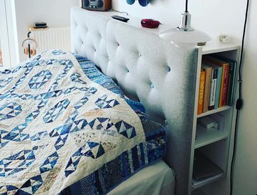 Jennie Connolly Voergaard her bygget denne fine sengegavl med opbevaring i sit soveværelse. hun har tilføjet ekstra personlighed ved at vælge forskelligfarvede knapper.