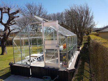 Drivhuset her har fået nye "sko". Renee Nielsen har sat 52cm sokkel under drivhuset og lavet fast bund. - Selv plantekasserne inde i drivhuset er hjemmelavede.