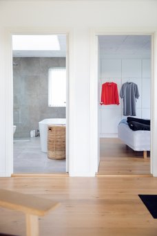 Byg færre kvadratmeter: I 2019 var et nybygget parcelhus i gennemsnit 210 kvadratmeter ifølge Danmarks Statistik. Dennis og Louises hus er 140 kvadratmeter. Planløsningen er også langtidssikret, da sønnen Benjamin har et tilstødende badeværelse til sit værelse, som han kan bruge som voksen, når han kommer på besøg med sin familie.