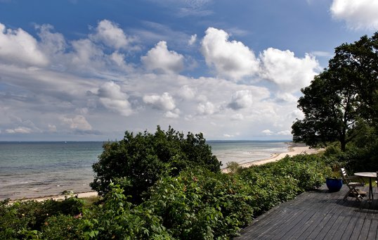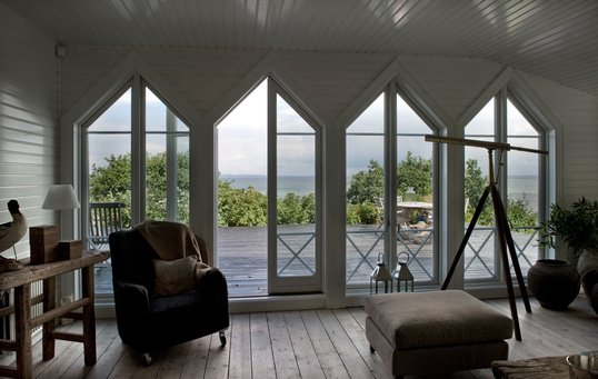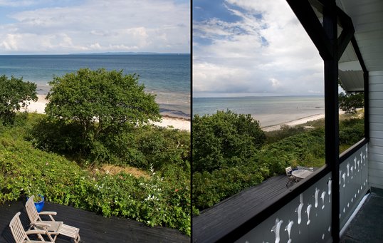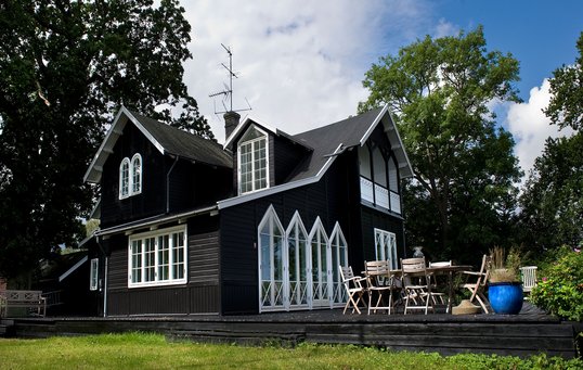 Sort træhus med havudsigt