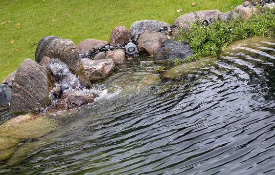 - En pumpe cirkulerer vandet rundt og 'skubber' sammen med vinden nedfald som blade over i en lille skimmersø på den anden side af 'gangbroen'.