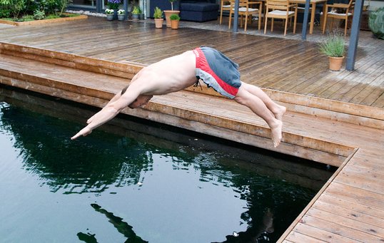 De kontaktede hurtigt Lars Juncker fra firmaet Junckerhaven, der blev nævnt i artiklen, og som laver svømmesøer. De mødtes, der blev lavet skitser, og Lars Juncker gav et tilbud på 240.000 kr. for svømmesøen samt en forlængelse af terrassen inklusive en terrasse-ø, hvor solen kan nydes fra et par havestole. Klavs Holm ville lige tjekke, hvad en swimmingpool kostede, og da han fik en pris på den på 280.000 kr. uden gravearbejde, sagde familien ja tak til svømmesøen.