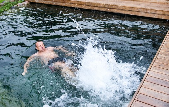 - Vi er i vandet hver dag, og når det er rigtig varmt, er vi i hele tiden. Når man kommer hjem fra løbeturen, så er det lige i. Vandet er blødt og friskt, og oplevelsen af helt klart ferskvand uden en dråbe klor eller andre kemikalier er dejlig, fortæller Klavs Holm.