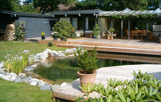 Søen er blevet et punkt, hvor øjnene automatisk kører hen året rundt. Og det forstår man godt, som den ligger der op ad terrassen omkranset af flere blommetræer og rododendroner, med bl.a. elefantgræs og iris helt tæt på og med krukker med planter fordelt rundt på terrassen. Søen passer perfekt til det 160 kvadratmeter store hus med fladt tag, og fra terrassen er der udsigt nedover et mindre naturområde.