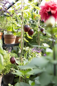 Kun en vin, et ferskentræ og nogle tomatplanter står i jorden i drivhuset. Resten er plantet i krukker, der er nemmere at møblere rundt med henover sæsonen.