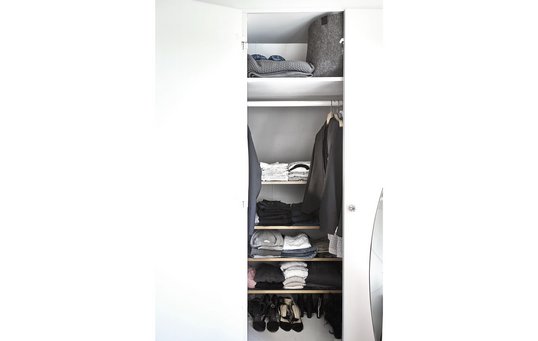 - Saml jeres garderober ét sted, fx en skabsvæg med plads til hele familiens tøj og ting.