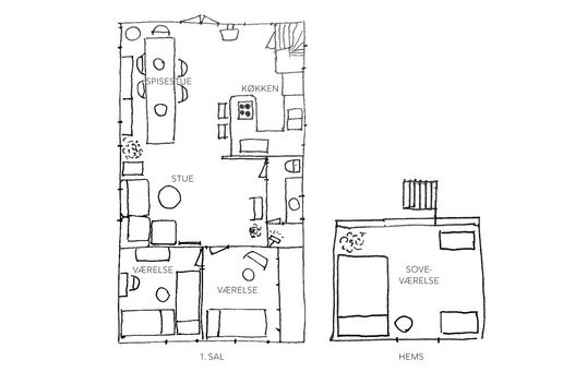 Mit første projekt var at få indretningen til at gå op. Lejligheden havde bare to værelser fordelt på i alt 70 m2 og bestod reelt set af ét stort rum – køkken, spise- og dagligstue – samt et soveværelse. Med tre halv- og helstore voksne i husstanden var der brug for et og helst også to værelser mere, hvis vi skulle have mulighed for lidt privatliv hver især.