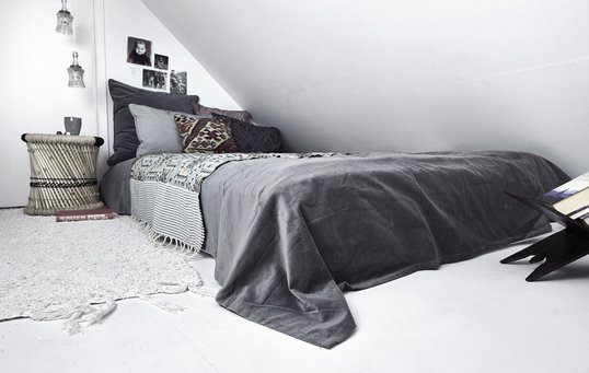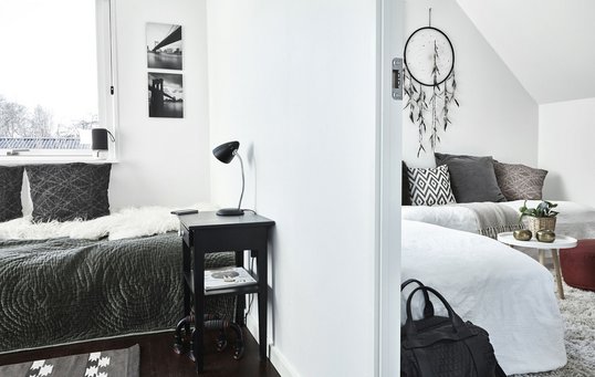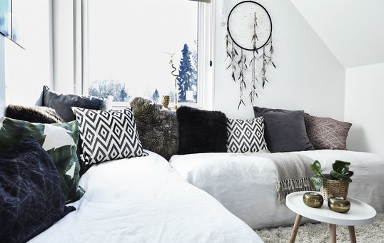 - En sovesofa er en løsning, hvis stuen ikke kan deles. En stor daybed kan være seng om natten og sofa om dagen. Opbevar sengetøj i store pudebetræk til gulvpuder, eller læg det under daybed’en i en praktisk sengeskuffe.