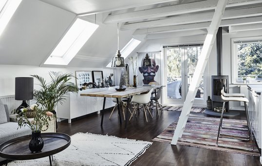 Jeg var bare ikke helt klar til den løsning, fordi jeg i så fald skulle tilbringe det meste af døgnets timer i det samme rum. Jeg er selvstændig og har arbejdsplads ved spisebordet, og tanken om at sove i det samme rum, som jeg arbejder, laver mad, spiser og holder fri i, blev en smule klaustrofobisk. Jeg opererede længe med overvejelser om endnu en opdeling med væg, men der var hensyn til både skråvægge, en radiator og vinduer i spil, og det gav både besværlige og fordyrende komplikationer.
