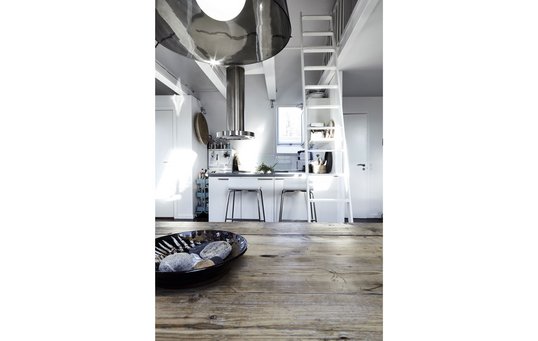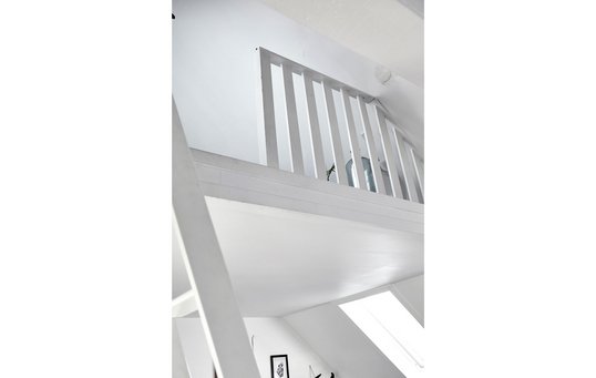 Lejligheden har en lille hems oppe under tagryggen med adgang via en stige. Efter en grundig oprydning, benhård udsmidning og en gang maling blev det mit soveværelse. Foto: Lene Samsø