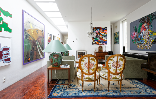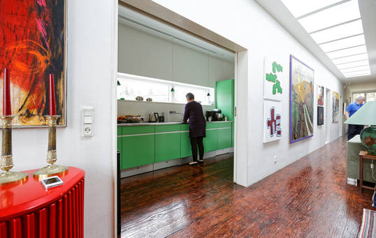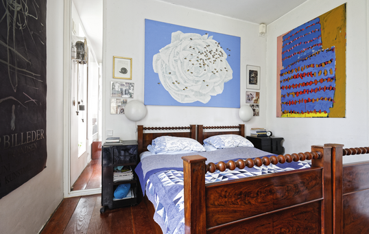 Både Steen og Wibeke holder af farver og overvejer p.t. en blå stuevæg. Indtil videre er det dog kunsten og møblerne, som tilfører rummene kulør sammen med det lindegrønne Abitare-køkken. Husets møbler er ikke de danske møbelklassikere, man så ofte ser, men derimod en blanding af hollandsk, italiensk og engelsk design som fx de to sofaer i støvet grøn, der er designet af italienske Rodolfo Dordoni for firmaet Minotti. I øvrigt er alle husets øbler en kombination af moderne og antik, købt på auktion eller arvet:
