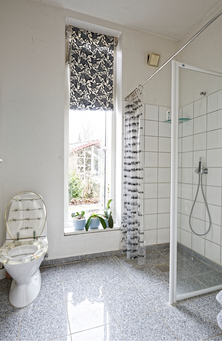 Fra ovenlysvinduer og store vinduespartier med skydedøre i husets ender strømmer lyset ind. På husets ene side er der høje, smalle vinduer – dog med usynlige raster i toiletvinduerne for at hindre indkig.