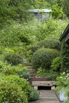 Have med vilde områder og frodige bede tæt på huset