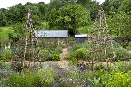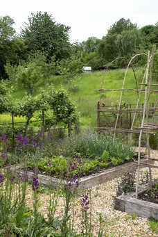 Køkkenhaven er anlagt på klassisk vis med højbede med grusgange imellem og dekorative hjemmeflettede plantestativer til at støtte og give struktur i de blomster- og grøntsagsrige bede.