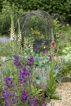 Alison Jenkins i køkkenhaven, hvor hovedgangen er indrammet med flettede buer for at give højde og struktur til haverummet.