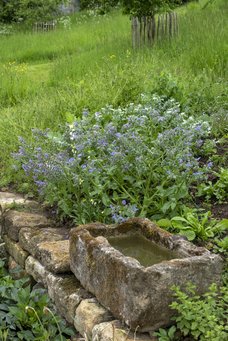 Mens hun fortæller, suser en fugl frem og tilbage fra en rede i hækken foran det store vinduesparti i køkken-alrummet. Også andre dyr har glæde af haven, hvor en naturlig kilde, der løber i jorden under bakken ved huset, flyder ned i et stentrug på terrassen og fortsætter i en rende hen over den.