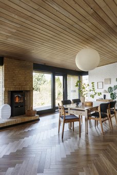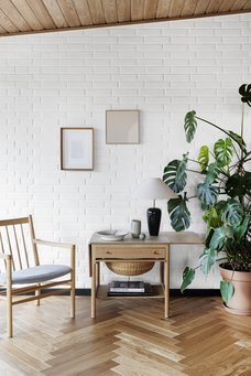 Det nye gulv i olieret sildebensparket havde ejerne set i andre huse fra 60’erne og følte, at det var et valg, som gav god mening. Nogle af murstensvæggene er malet hvide af den tidligere ejer. Det lysner, men Vibe Hedal Næser havde foretrukket dem rå og umalede.