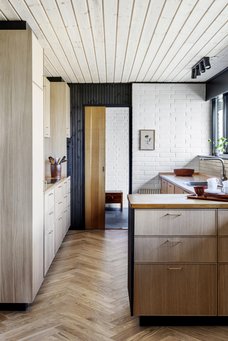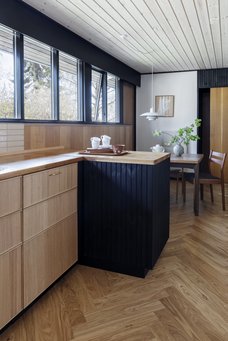 De originale køkkenskabe er udskiftet med nye, men bordpladen og vasken er genbrugt.