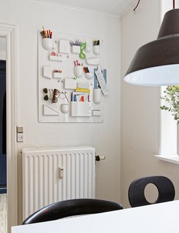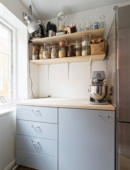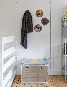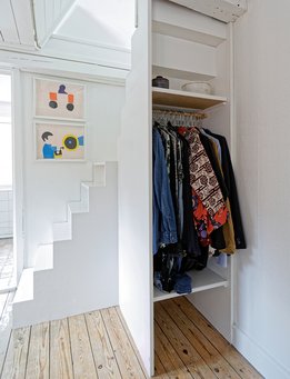 Med en lejlighed af denne størrelse er det nødvendigt at begrænse omfanget af møbler og ting. Det har Maria og Jacob for længst erkendt. De går op i at bo og leve minimalistisk med en begrænset mængde tøj, legetøj, køkkenudstyr og bøger, og de overvejer jævnligt, hvordan de rydde ud, hvis tingene ikke har været i brug længe. Den begrænsede plads betyder også, at de dyrker den særlige disciplin at give tingene flere funktioner. For eksempel kan den nederste trappesektion fra entré til stue trækkes ud og på bagsiden og bruges til opbevaring af værktøj.