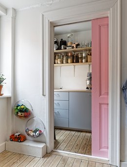 – Vi bruger farver aktivt og ændrer det også gerne for at optimere boligen. For eksempel er hovedøren for tiden mørkeblå, mens den pladsbesparende skydedør mellem køkken og grovkøkken er malet pink, og gulvet i soverummet allerøverst er lysegrønt. På den måde er det, der larmer velkomment, selv om boligen allerede kan så meget i sig selv, mener Maria.