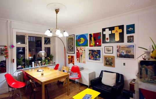 Her er smagfuldt indrettet med en blanding af gamle møbler fra 1960'erne som fx den sorte slidte lædersofa købt på lauritz.com samt moderne møbler som de knaldrøde Eames-stole og et stænk af humor i form af fantasifulde stillebener og Mortens malerier på væggene.