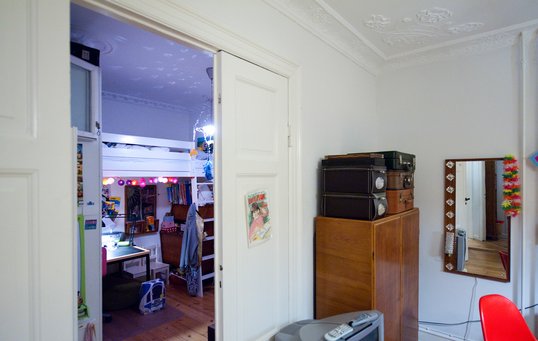 Begge oprindelige værelser er opdelt med store klædeskabe fra Ikea, som vender hver sin vej, så der er ét skab i hvert værelse. Uden om skabene er der opbygget en dobbelt gipsvæg med isolering i midten, der fungerer lyddæmpende.