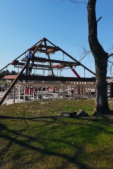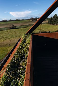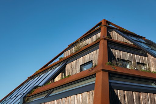 - Øverst på pyramiden er der en lille terrasse, som man kun kan komme op på via en lang, udvendig trappe, der også er lavet af cortenstål.