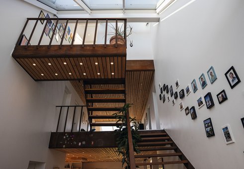 Netop det at have tingene tæt på er Pers forklaring på, hvordan han kom i tanke om at bygge og bo i en pyramide. Trods husets enorme størrelse virker det ikke overvældende stort indenfor. I stueetagen går køkken, alrum og stue næsten i ét. Det er husets hjerte. Her er også kontor og bryggers.