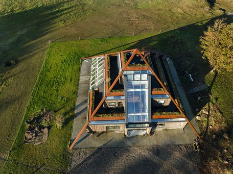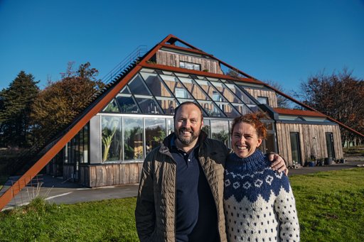 Maria Fenger smiler, mens hun peger op mod skovvejen, hvor folk på gåtur stopper op, når de får øje på hendes hjem. Som om de ikke helt kan forstå, at der vitterlig ligger en over otte meter høj pyramide i landskabet foran dem. Som er en bolig. Et trekantet hjem midt i Himmerland med gårde, får og køer. Højst usædvanligt.