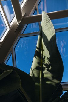 Køkkenet og ”spisestuen” er nærmest opbygget som et orangeri med meget lysindfald og indvendige træer i de store kummer.