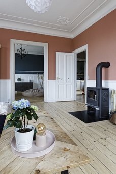 – Det eneste, vi ikke vil, er at bo med hvide, kønsløse vægge, som huset havde, da vi overtog det. Vi kunne se de mange muligheder i rummene og valgte hvidt træværk, blandt andet på de høje paneler i stuerne. Lofterne forblev hvide, og så håndplukkede vi forskellige smukke farver til de resterende vægge.